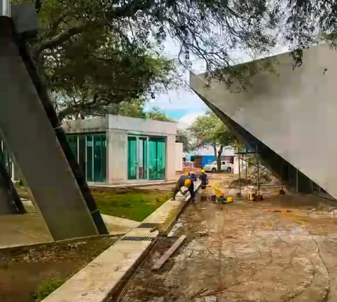 Avanza la colocación en accesos a cantina y gimnasio, con base preparada y cordón perimetral.
